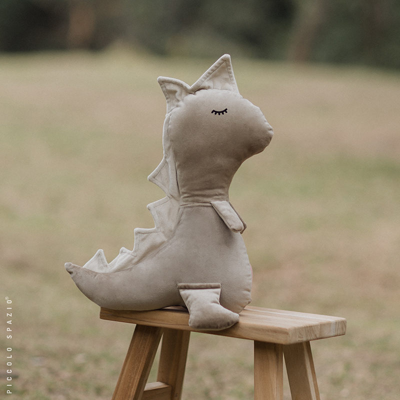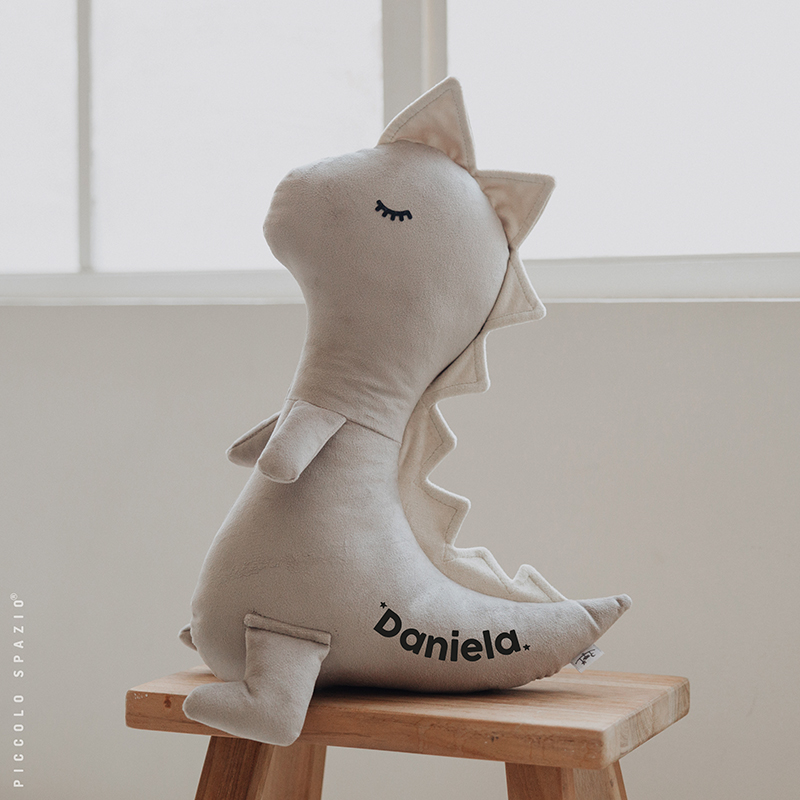 Cojín personalizable con el nombre de tu peque, en forma de dinosaurio T.Rex en color beige.