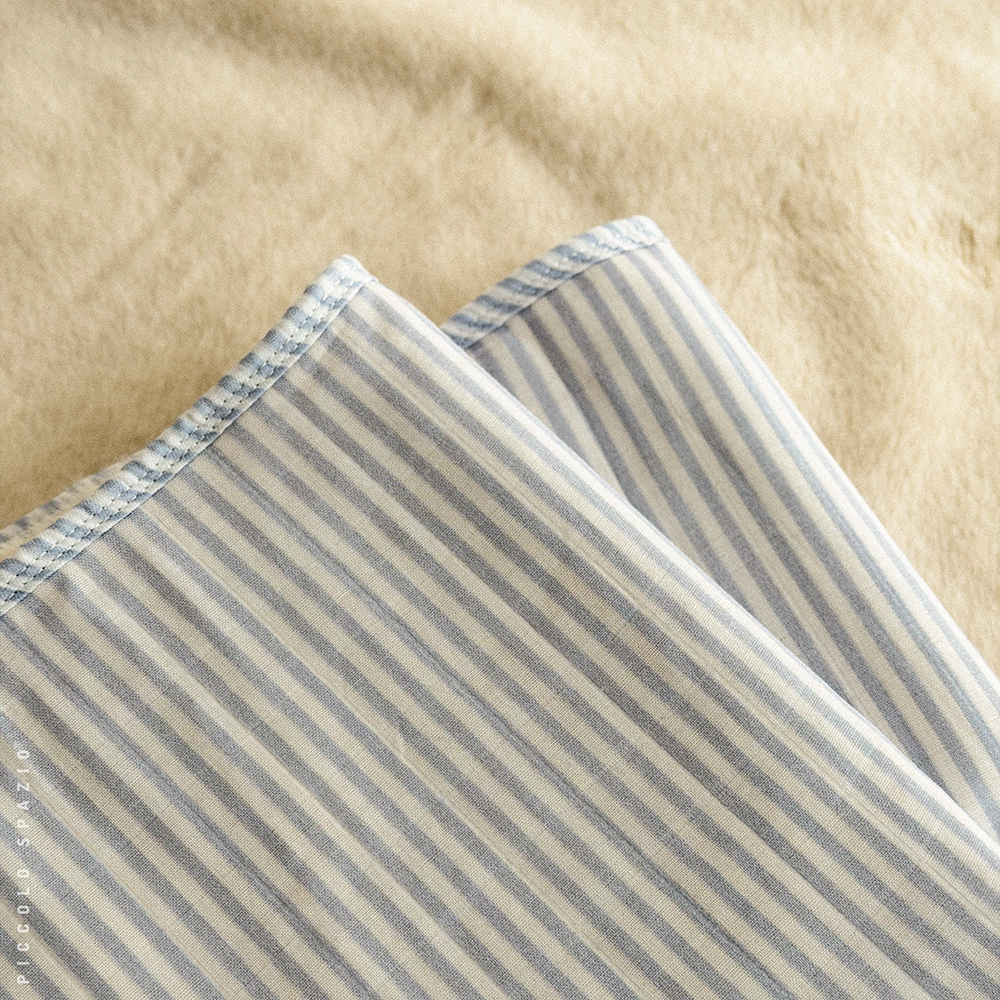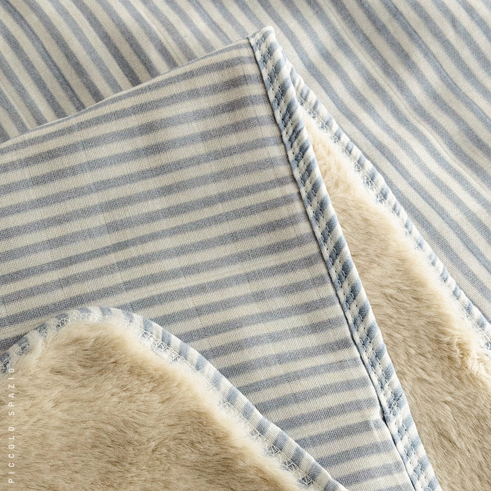 Frazada de doble cara, algodón por fuera y tejido polar por dentro, personalizable con el nombre de tu bebé, color azul a rayas.